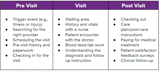 - Patient journey can be categorized into three major categories : pre-visit, visit, and post-visit.